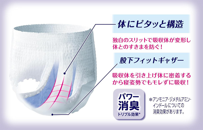 7回吸収で朝まで交換不要。 消臭機能付きでニオイも気になりにくいです。 ウエストのゴムが柔らかく、締め付け感が少ないのもポイントです。